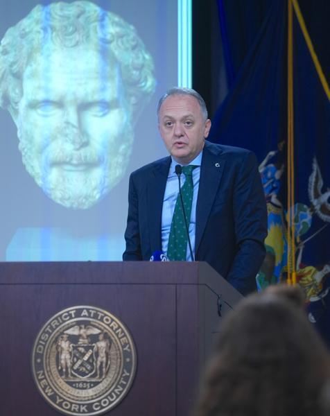 Törende Türkiye Cumhuriyeti Kültür ve Turizm Bakan Yardımcısı Gökhan Yazgı, Yardımcı Bölge Savcısı ve Kaçakçılıkla Mücadele Birimi Başkanı Matthew Bogdanos ile ABD İç Güvenlik Soruşturmaları (HSI) Yardımcı Özel Sorumlu Ajanı Tom Acocella konuşma yaptı.