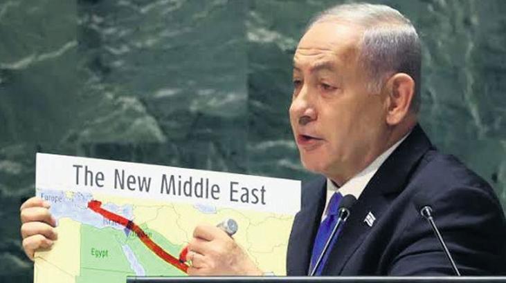 Sayfada İsrail Başbakanı Netanyahu’nun BM kürsüsünde çekilmiş iki fotoğrafını görüyorsunuz. İkisinde de elinde kırmızı uçlu bir kalem var. Birinci fotoğraf 2012’de çekilmiş. “İran’ın sürmekte olan Uranyum zenginleştirme faaliyetleri ve nükleer silah …