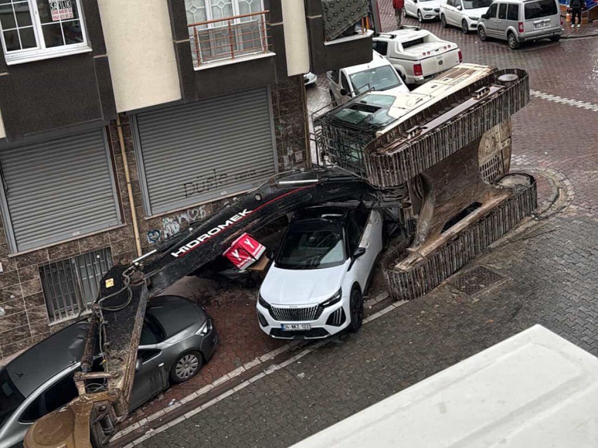Görüntülerde tırın taşıdığı iş makinesinin devrildiği ve kepçesinin park halindeki 2 otomobil ile motosikletin üzerine düştüğü görülüyor.